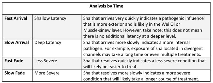 The amount of time it takes for sha to arrive or fade is an important diagnostic marker. The arrival time of sha is related to the depth of the pathogenic influence. Sha that appears quickly is more superficial than sha that takes longer to form. For example, if a patient has an acute wind invasion, sha is likely to appear quickly because the pathogenic influence is near the surface. However, since the divergent channels are one of the deepest channel systems in the body, xie qi located there may take several minutes or even multiple treatments before sha appears.
